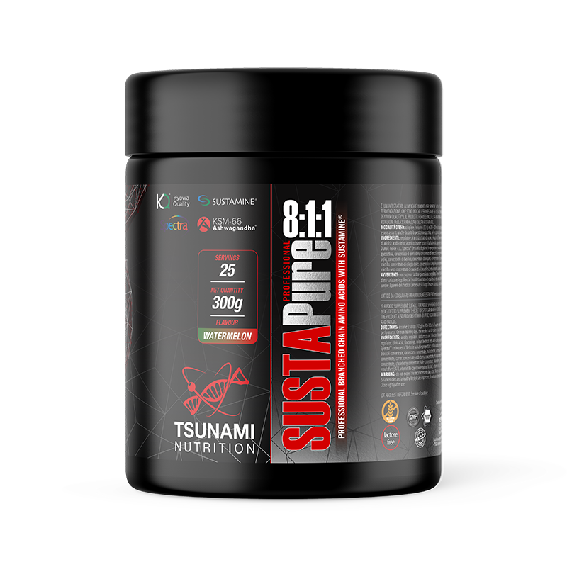 Tsunami Nutrition SUSTAPure PROFESSIONAL BCAA 8:1:1 Kyowa Quality® is a Kyowa Quality® 8:1:1 ratio amino acid supplement with added l-alanyl glutamine, Spectra™ and Ashwagandha KSM 66™.