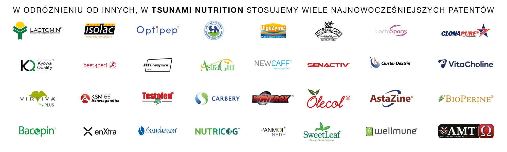 Jedną z cech wyróżniających Tsunami Nutrition jest wybór stosowania opatentowanych surowców oraz składników najwyższej jakości, często popartych badaniami klinicznymi i niezależnymi pracami naukowymi. W recepturach znajdują się starannie dobrane międzynarodowe patenty, których celem jest oferowanie produktów nie tylko „bogatych w substancje aktywne”, lecz przede wszystkim skutecznych i niezawodnych w długim okresie.